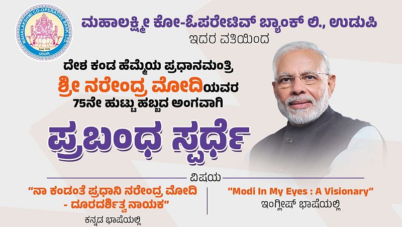 ಮಹಾಲಕ್ಷ್ಮೀ ಕೋ ಆಪರೇಟಿವ್ ಬ್ಯಾಂಕ್ ವತಿಯಿಂದ ಪ್ರಧಾನಿ ನರೇಂದ್ರ ಮೋದಿಯವರ 75 ನೇ ಹುಟ್ಟು ಹಬ್ಬದ ಪ್ರಯುಕ್ತ ವಿದ್ಯಾರ್ಥಿಗಳಿಗೆ ಪ್ರಬಂಧ ಸ್ಪರ್ಧೆಯನ್ನು ಅಕ್ಟೋಬರ್ 25 ಶನಿವಾರ ಬೆಳಿಗ್ಗೆ 9.30ಕ್ಕೆ ಉಡುಪಿಯ ಶ್ಯಾಮಿಲಿ ಸಭಾಂಗಣದಲ್ಲಿ ಆಯೋಜಿಸಿರುವುದಾಗಿ ಬ್ಯಾಂಕಿನ ಅಧ್ಯಕ್ಷರಾದ ಉಡುಪಿ ಶಾಸಕ ಯಶ್ ಪಾಲ್ ಸುವರ್ಣ ತಿಳಿಸಿದ್ದಾರೆ.