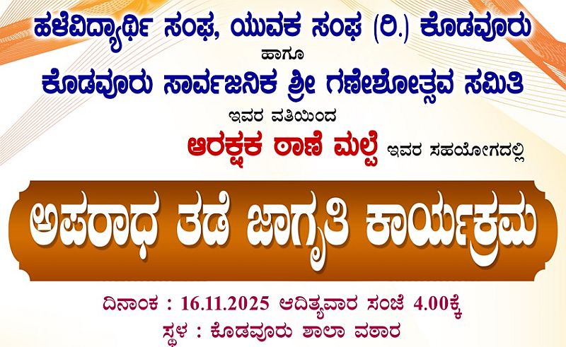 ನ. 16: ಕೊಡವೂರಿನಲ್ಲಿ ಅಪರಾಧ ತಡೆ ಜಾಗೃತಿ ಕಾರ್ಯಕ್ರಮ
