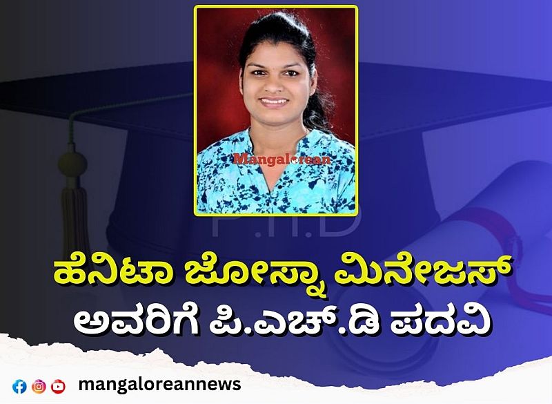 ಹೆನಿಟಾ ಜೋಸ್ನಾ ಮಿನೇಜಸ್ ಅವರಿಗೆ ಪಿ.ಎಚ್.ಡಿ ಪದವಿ