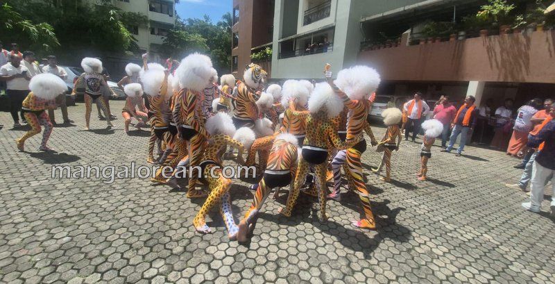 Earlier this morning, traffic was briefly interrupted at Kadri–Pumpwell to facilitate the crossing of the 70-member tiger dance troupe from Bajilakere Friends. The group then proceeded towards Bunts Hostel–Balmatta Road, where they delivered a captivating performance to the delight of assembled spectators.