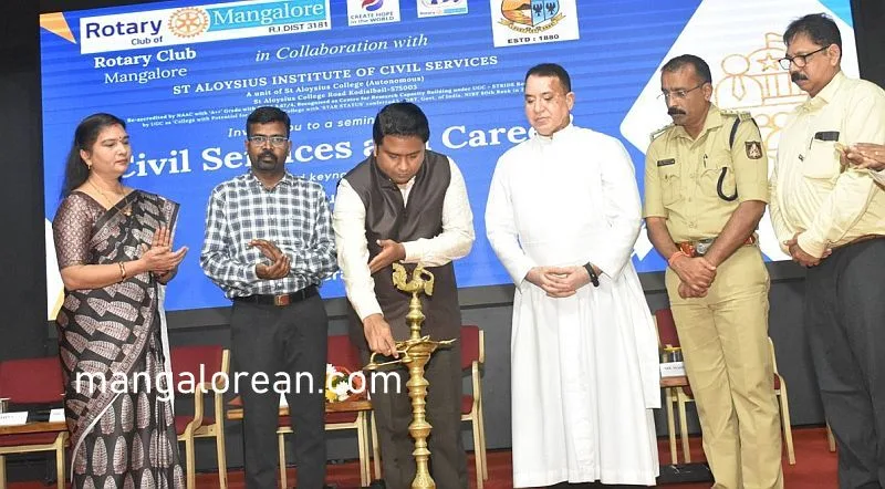 A Seminar ‘CIVIL SERVICE AS A CAREER’ was held at Robert Sequeira Hall, St Aloysius College, hosted by St Aloysius Institute of Civil Services in collaboration with the Rotary Club of Mangalore. The programme began with a prayer song by the college choir, followed by a welcome address by Rtn Dr Arjun Nayak -Director, Vocational Services, Rotary Club of Mangaluru. The programme was inaugurated by lighting of the lamp by the dignitaries on the dais, namely- Dakshina Kannada Deputy Commissioner Mullai Muhilan MP IAS, as a chief guest; joined by guests of honour- Dr Sankarganesh K IRS-the Assistant Commissioner, Income Tax range-1, Mangaluru; Smt Meera Pandit S- Assistant Commissioner of Commercial Tax, Admin, DGSTO, Mangaluru; Mahesh Kumar- Acp, Mangaluru City Police; Rev Dr Praveen Martis SJ-Director, St Aloysius Institute of Civil Services/Principal, St Aloysius College, Mangaluru; Rtn Kishan Kumar-President, Rotary Club of Mangalore; Rtn Dr Siddarth Shetty- Secretary, Rotary Club of Mangalore; Rtn Naveen R- Chairman, Career Guidance, Rotary Club of Mangalore, among others.