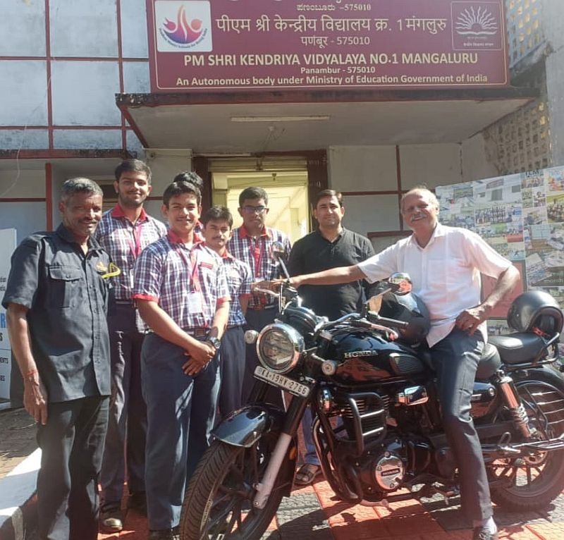 The bike tour informally rode out of Kendriya Vidyalaya No. 1, Mangalore (KVM) in Panambur, the alma mater of Nandagopal with wishes from students led by Principal Mr Tekchand Bhardwaj.
